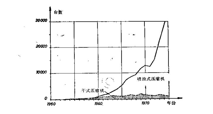 上圖十分清楚地表明, 在近15年內(nèi)螺桿式空壓機生產(chǎn)臺數(shù)的迅速增長情況,其中尤以噴油冷卻的空氣壓縮機及制冷壓縮機發(fā)展最快,而干式螺桿空壓機的產(chǎn)量則基本上保持不變。