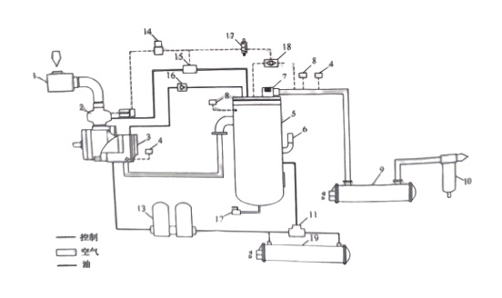 上圖為水冷型螺桿空壓機工作流程圖,1、空氣過濾器;2、進氣閥;3、主機;4、溫度傳感器;5、油氣桶;6、安全閥;7、最小壓力閥;8、壓力傳感器;9、后冷卻器;10、氣水分離器;11、溫控閥;12、排污閥;13、油過濾器;14、容調閥;15、放空閥;16、單向閥;17、電磁閥;18、梭閥;19、油冷卻器;