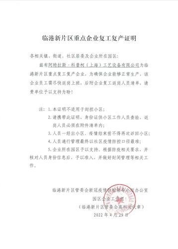 阿特拉斯·科普柯時刻關(guān)注復(fù)工事宜,公司與區(qū)領(lǐng)導(dǎo)始終保持聯(lián)系,并提前制定了公司復(fù)工防疫管控方案,并在第一時間提交了復(fù)工申請資料。就在4月29日區(qū)委會向上海市經(jīng)信委批復(fù),最終公司通過了復(fù)工申請。目前阿特拉斯·科普柯已經(jīng)陸續(xù)有員工返廠上班。公司將嚴(yán)格按照政府防疫要求,落實復(fù)工防疫要求,保障防疫以及生產(chǎn)進(jìn)行。