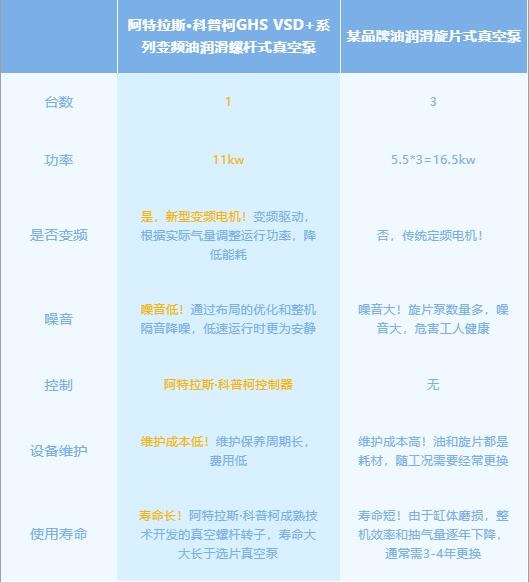 目前很多汽車廠家在汽車復合模工藝中使用的都是真空應用有水環(huán)泵,油旋片真空泵。但是水環(huán)真空泵的能耗非常高且很容易因為水而受到影響,特別是在炎熱的夏季工作液會因為環(huán)境溫度一起升高,從而降了設備效率并影響真空度,最終不能滿足工藝的生產要求。雖然油旋片真空泵的真空度比較高,但是故障率比較大。而且后期的維修保養(yǎng)成本比較高。因此這兩種類型真空泵都不能滿足現(xiàn)在工藝要求。針對這種情況阿特拉斯·科普柯推出了GHS VSD+真空泵。針對某汽車零部件生產企業(yè)的4臺汽車門板復合模設備,阿特拉斯·科普柯采用1臺GHS 730 VSD+替代原有3臺5.5KW旋片真空泵。相比傳統(tǒng)真空泵GHS VSD+有哪些優(yōu)勢呢(如下圖)。