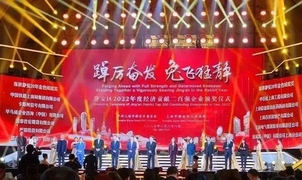2月28日下午,踔厲奮發 兔飛猛靜 靜安區2022年度經濟貢獻二百強企業頒獎儀式在上海展覽中心舉行。儀式上,靜安區領導于勇、王華、顧云豪、王益群、宋宗德、王翔、高飛、莫亮金、