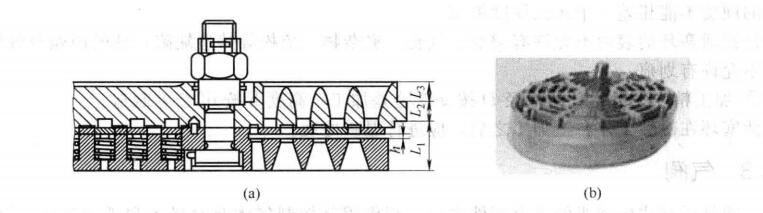 2、網狀閥如圖所示為網狀閥的結構。閥片呈網狀,相當于將環狀閥片連成一體。閥片本身具有彈性,自中心起的第二圈上將徑向筋條銑出一個斜口,同時在很長弧度內銑薄。閥片中心、圈被夾緊而外緣四周作為閥片時。即能在升程內上下運動。